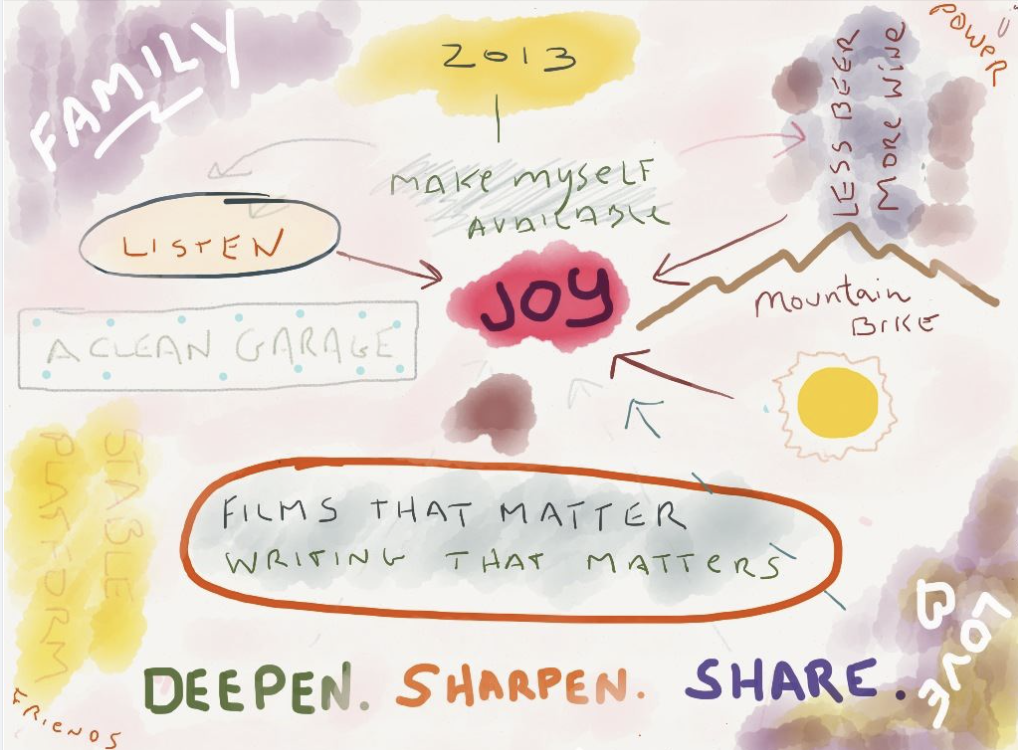 This is a drawing I stumbled upon that I made in 2012 in preparation for 2013. These are sort of like New Year’s Resolutions I imagine except scribbled as cave paintings and dreams. All applies now more than ever I think, and I still hang tightly onto the words Deepen, Sharpen, and Share. They are good anchors and angels: